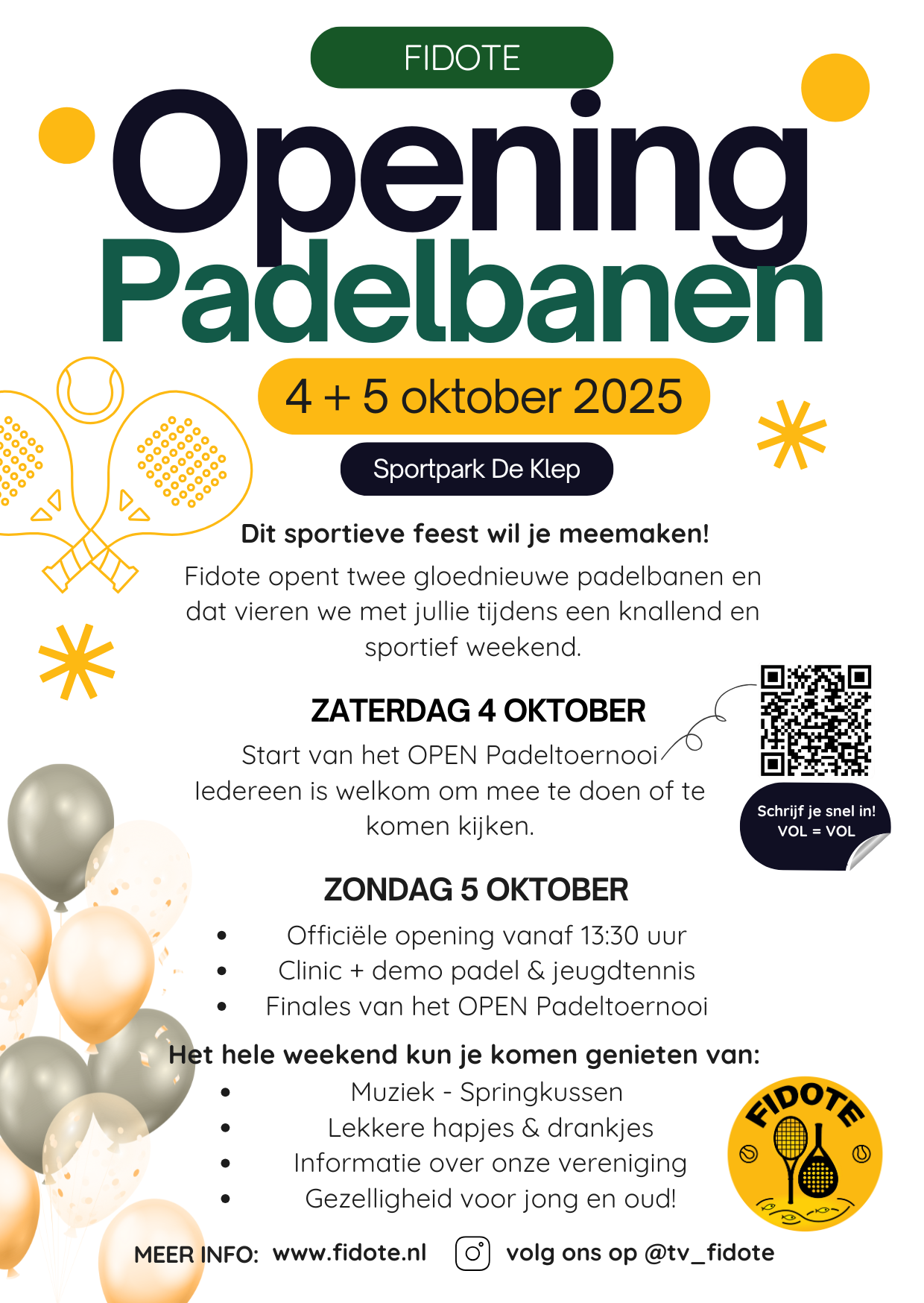 Laat je weten of we op jullie komst mogen rekenen? Dat kan door te reageren op onderstaande link: Aanmelding officiële opening padelbanen fidote
