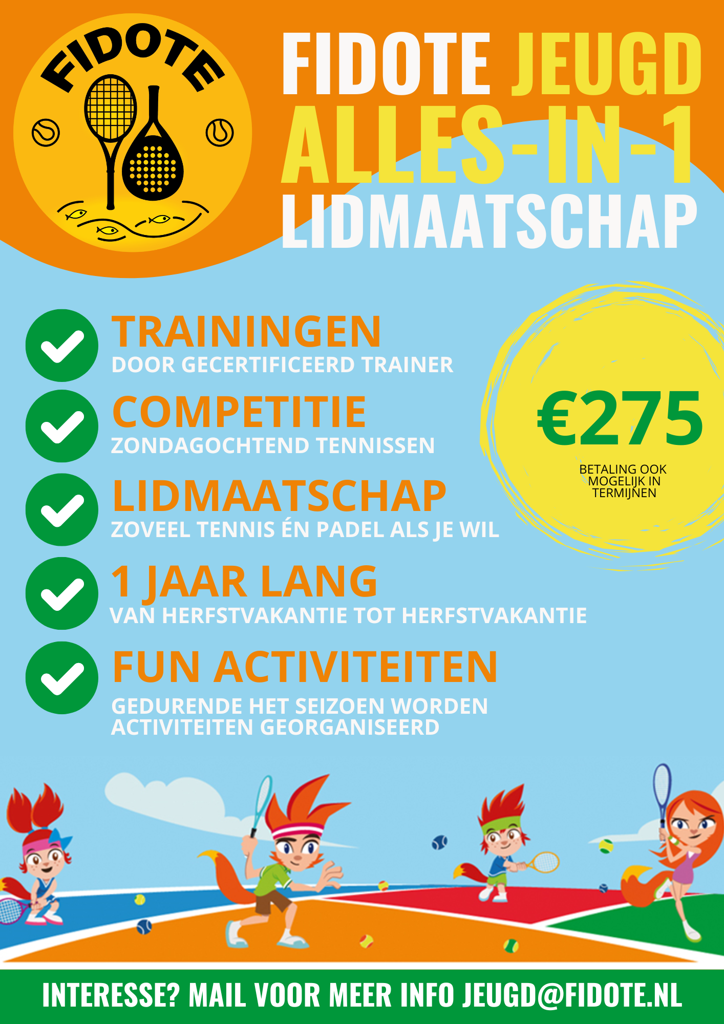 Jeugdleden zijn van harte welkom bij Fidote. Na een aantrekkelijke (eenmalige) start-aanbieding in 2025, is het Alles-in-1 pakket nog steeds zo aantrekkelijk mogelijk gemaakt.