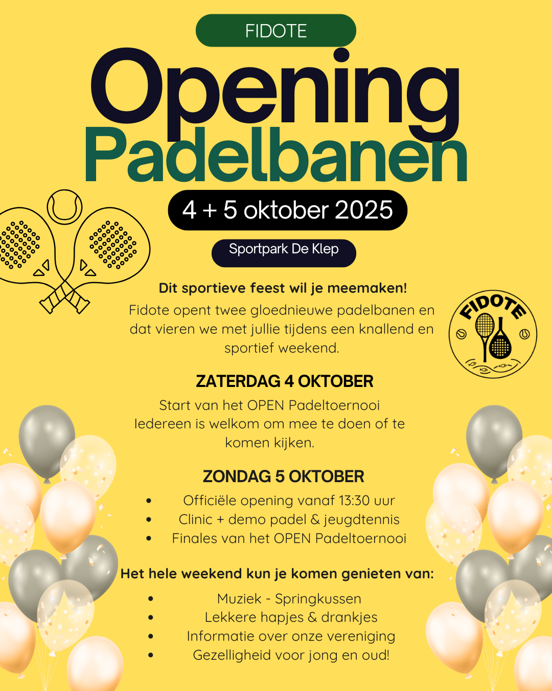 Gedurende het hele weekend zullen er leuke activiteiten voor jong en oud te vinden zijn bij onze vereniging, waaronder een open padeltoernooi, lancering van de nieuwe kledinglijn, demonstraties en kennismakingsclinics georganiseerd door tennisschool BOB. Een weekend vol gezelligheid voor iedereen met een lekker hapje en drankje!